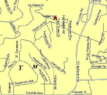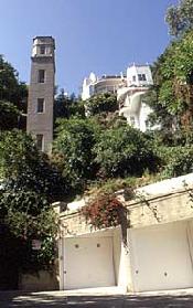 High Tower is an elevator to a terrace of homes on the hill. It's fun to try to find, but you'll need a key to run the elevator! If you'd like to walk to the top of the elevator, there's a path and stairs on the west side of the street. Just go straight on North Sycamore out of the Yamashiro parking lot or turn up Camrose Drive off of Highland.